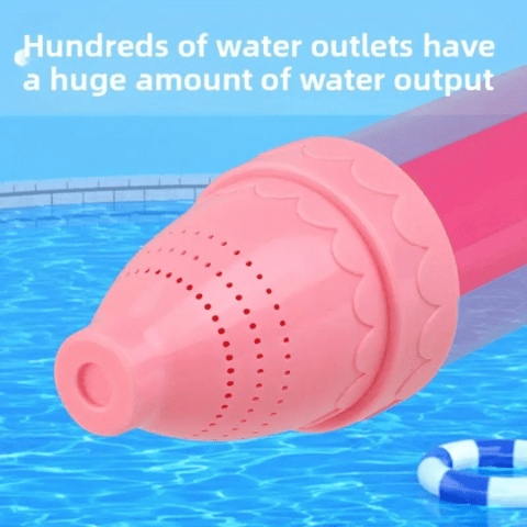 Designul alungit de 45 cm permite umplerea rapidă și lansarea jetului puternic, ideal pentru joacă în grădină sau la piscină.