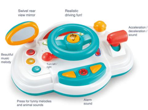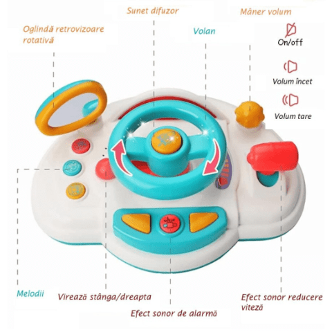 Volanul interactiv aduce bucurie și entuziasm, oferind copiilor senzația reală de condus, cu sunete vesele și lumini colorate.