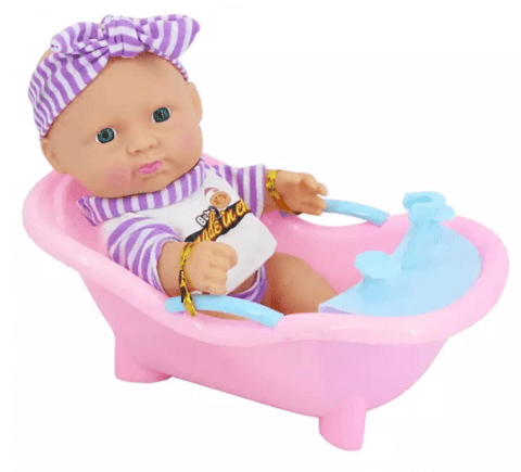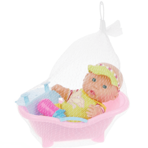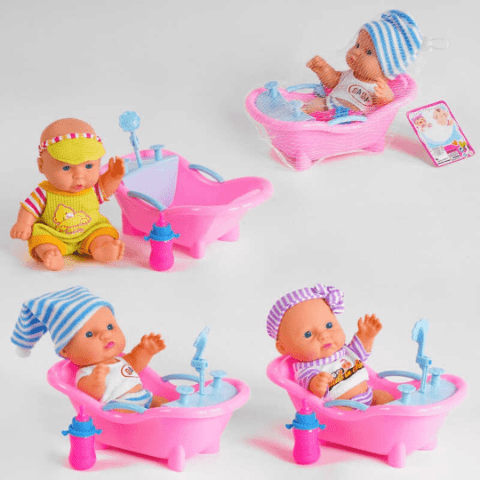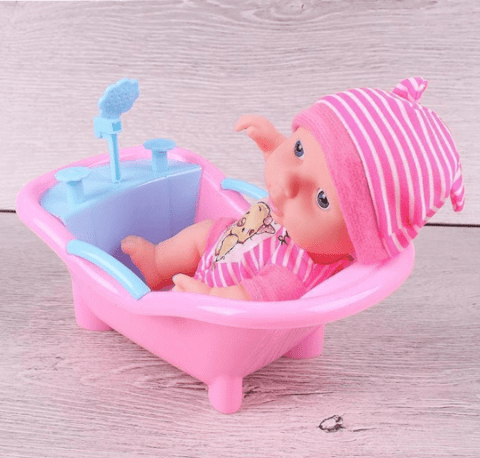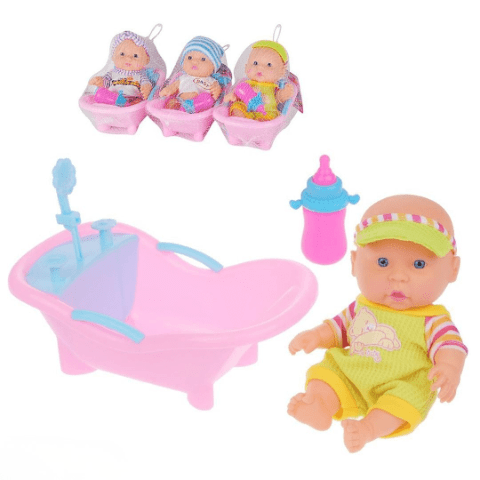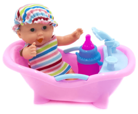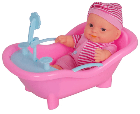 Micile mămici pot oferi bebelușului o baie relaxantă în cada roz cu duș și biberon.