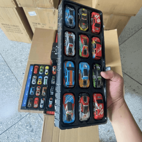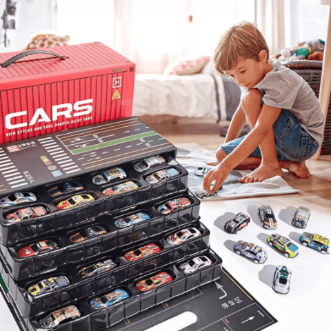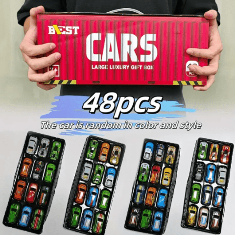 Setul conține 48 de mașinuțe din aliaj metalic, ambalate elegant într-o cutie tip container roșu ușor de transportat.