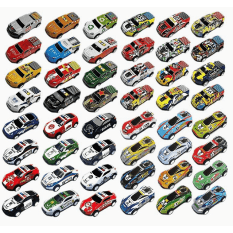 Modelele sunt variate — mașini de curse, poliție, pompieri, SUV-uri și mașini sport.