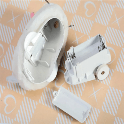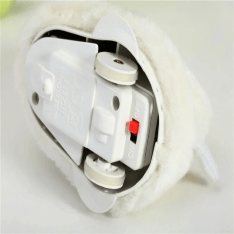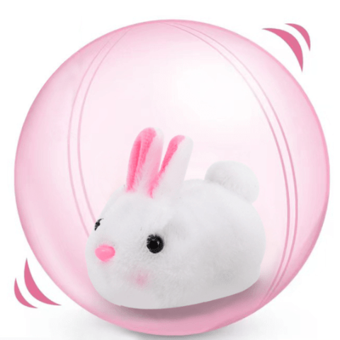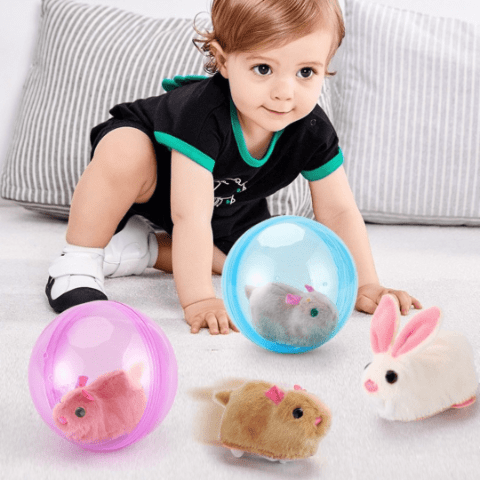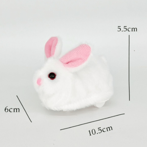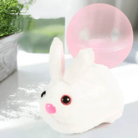 Iepurașul pufos și curios se mișcă singur, stârnind zâmbete și curiozitatea bebelușilor care îl urmăresc prin cameră.