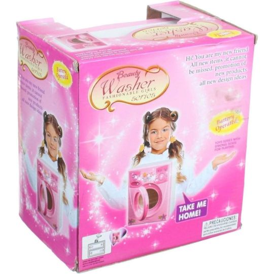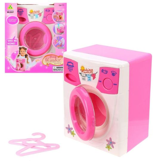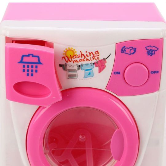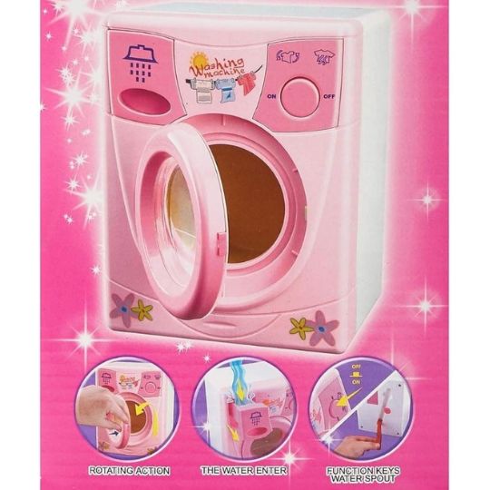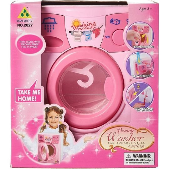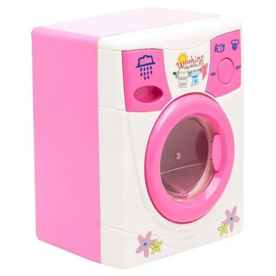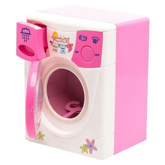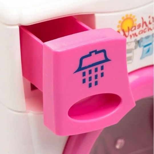 Această mașină de spălat jucărie este realizată într-un design atractiv, cu culori roz și detalii inspirate din electrocasnicele reale.