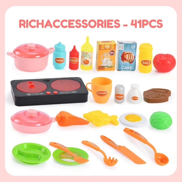 🍴 Set bogat de accesorii (41 piese) – oale, tigăi, ustensile, alimente și recipiente care permit scenarii de joacă variate și creative.
