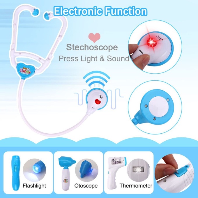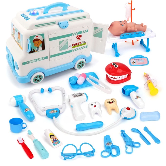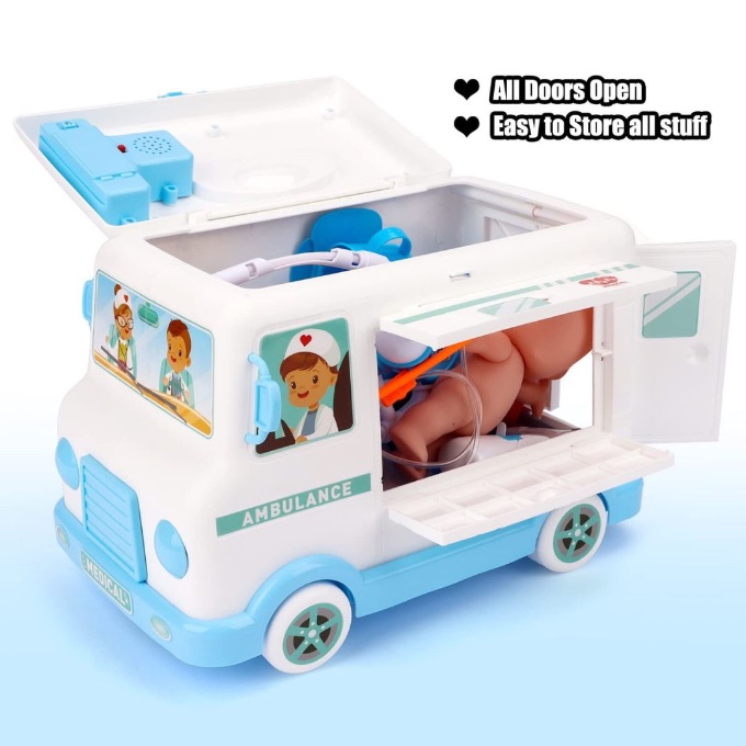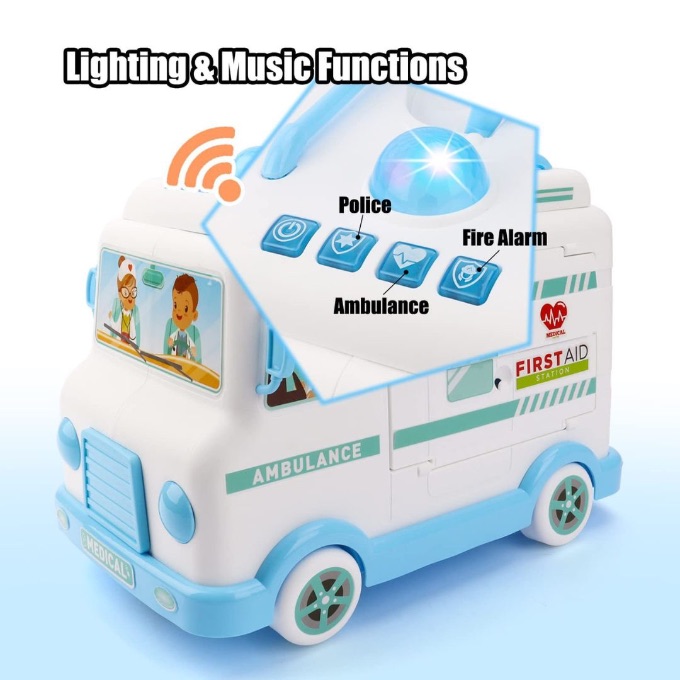 Această ambulanță de jucărie cu trusă medicală transformă copilul într-un mic doctor pregătit pentru orice urgență.