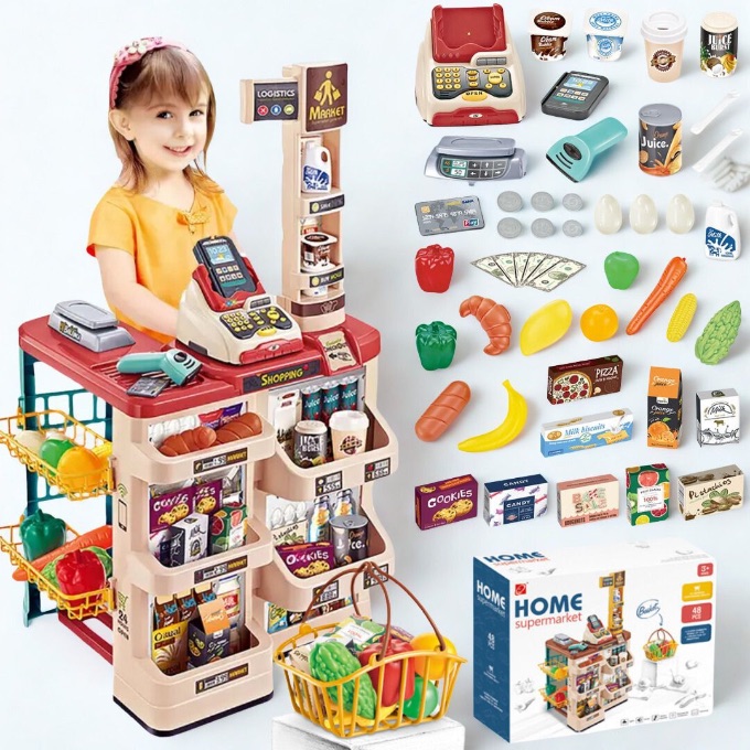 Transformă camera copilului într-un adevărat supermarket unde micii comercianți scanează produse, calculează și încasează ca în viața reală.