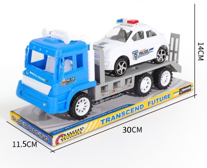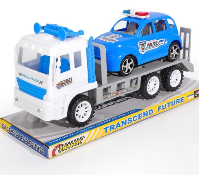 Acest camion de transport poliție permite copiilor să încarce și să transporte mașina de poliție, recreând misiuni reale de intervenție și patrulare.