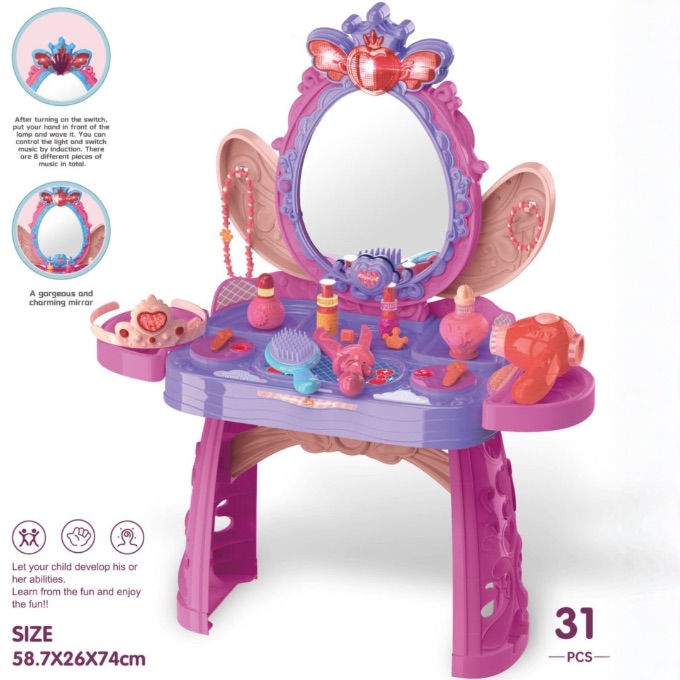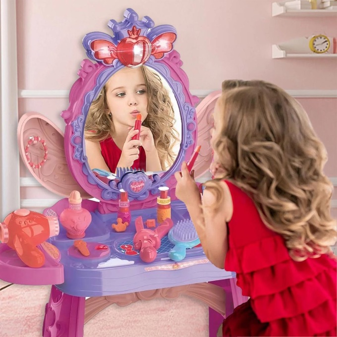 O măsuță de machiaj pentru copii cu lumini și muzică care transformă camera într-un adevărat salon de frumusețe.