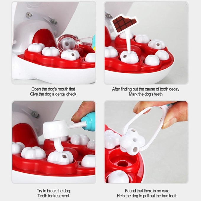 Cei mici pot examina, trata și scoate dinții cățelului folosind instrumente medicale realiste, dezvoltând empatia și încrederea.