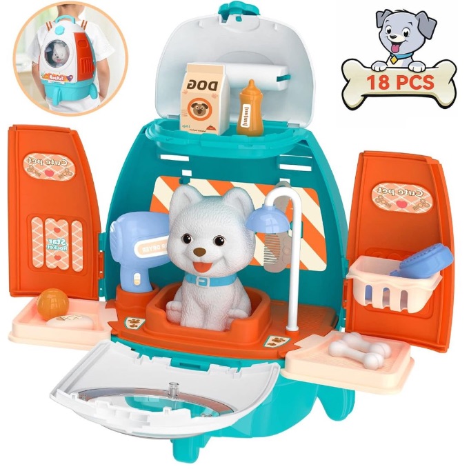 Acest set de îngrijire animale transformă copilul într-un mic veterinar care hrănește, spală și îngrijește cățelușul folosind accesorii realiste de joc de rol.