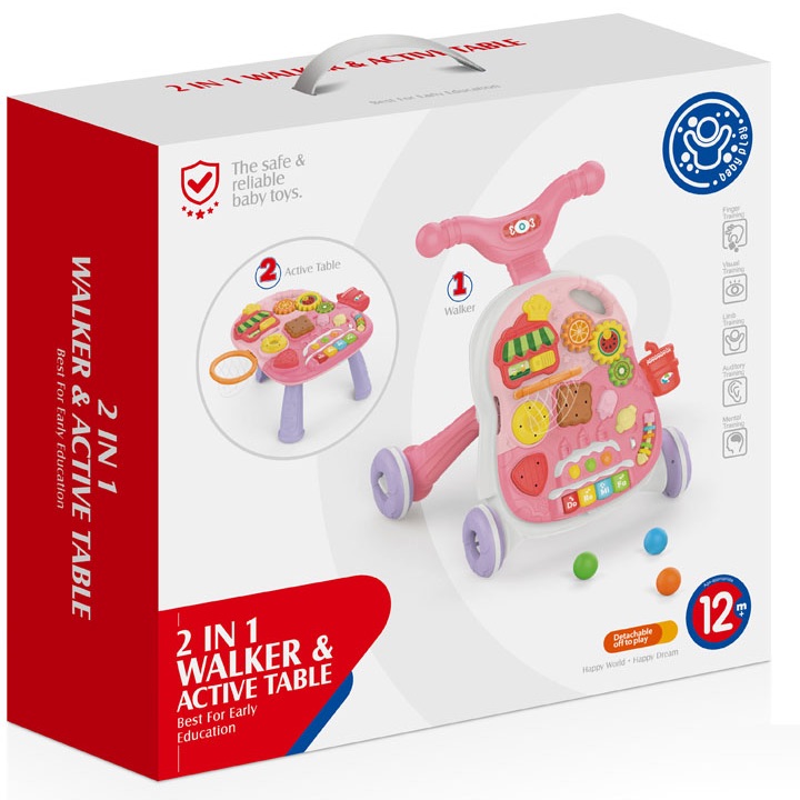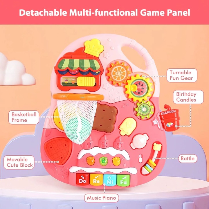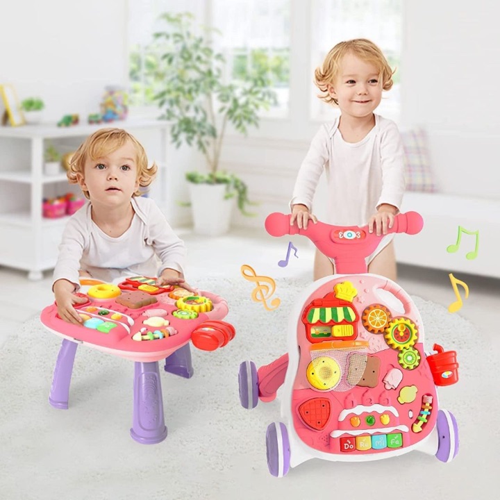 Poate fi folosit ca baby walker, masă de activități sau panou de joacă separat, fiind ideal atât pentru joaca independentă, cât și pentru dezvoltarea echilibrului și mișcării.
