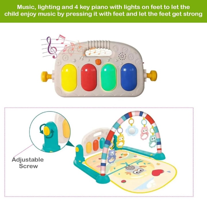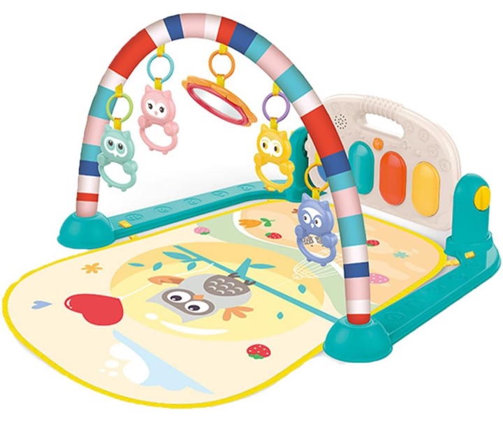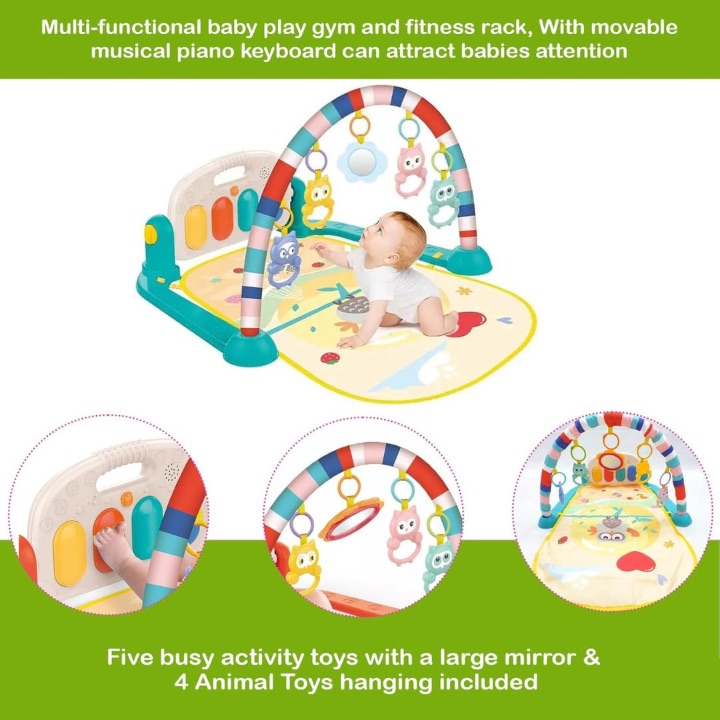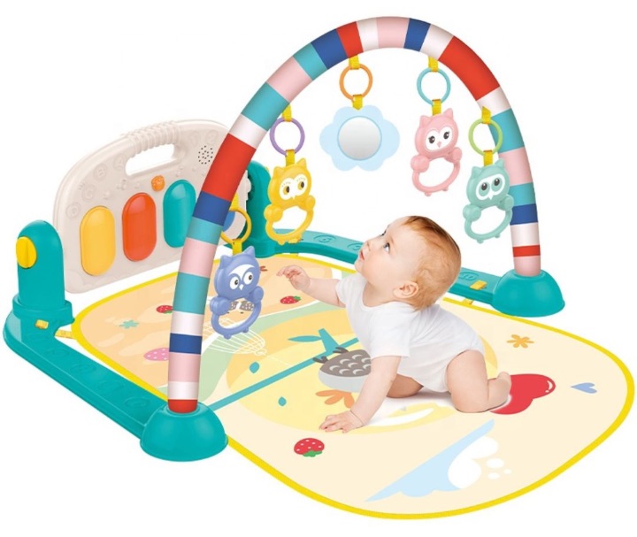 Bebelușul poate sta întins, poate lovi clapetele pianului cu piciorușele, poate atinge jucăriile suspendate și își poate descoperi reflexia în oglindă, transformând fiecare moment într-o experiență plină de curiozitate.