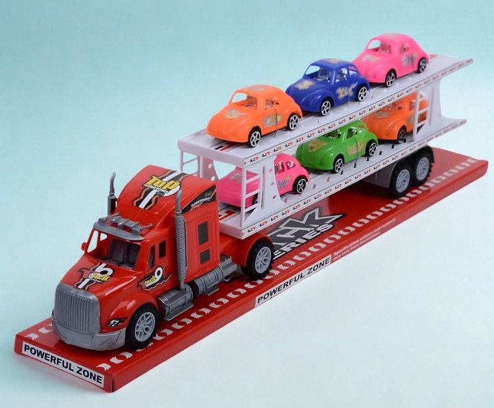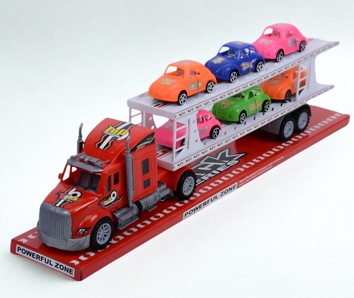 Camionul transportor cu 6 mașinuțe colorate aduce în camera copilului o joacă plină de mișcare, culoare și entuziasm, perfectă pentru cei mici pasionați de vehicule și curse.