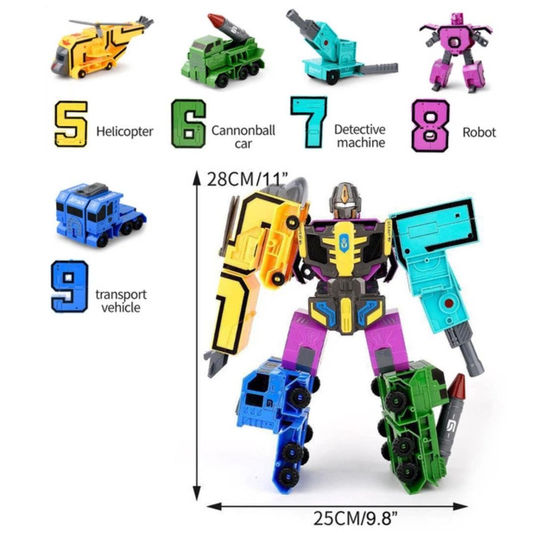 Robotul transformabil din cifrele 5-9 aduce în joacă o combinație spectaculoasă între numere, vehicule și aventură, fiind perfect pentru copiii care iubesc transformările creative.