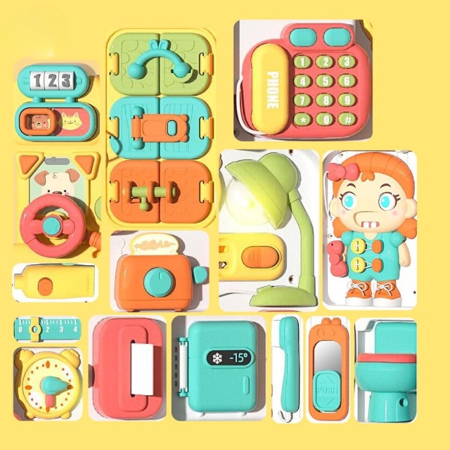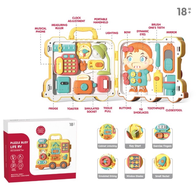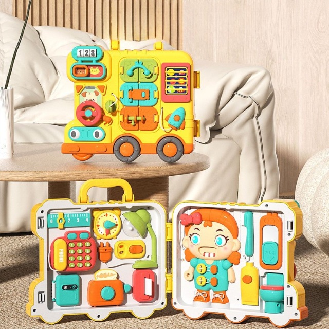 Fiecare element – fermoare, încuietori, rotițe, telefon, ceas, volan sau mini electrocasnice – stimulează coordonarea mână-ochi și autonomia prin activități inspirate din viața reală.