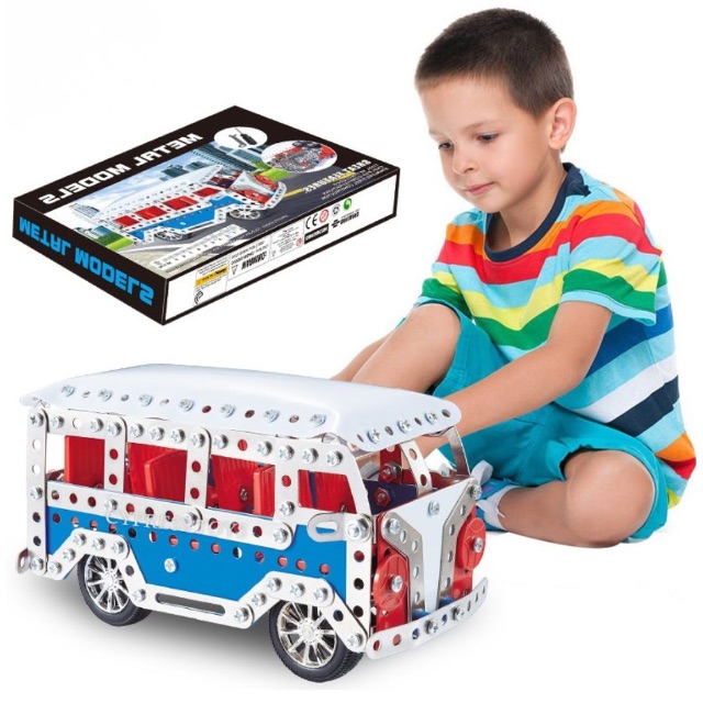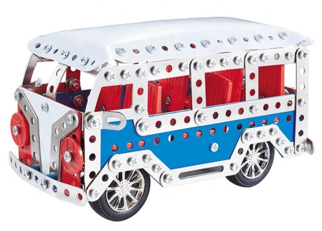 Constructorul metalic microbuz cu 337 piese oferă copiilor o experiență reală de asamblare, folosind șuruburi, piulițe și șurubelniță inclusă pentru a construi pas cu pas propriul model auto.